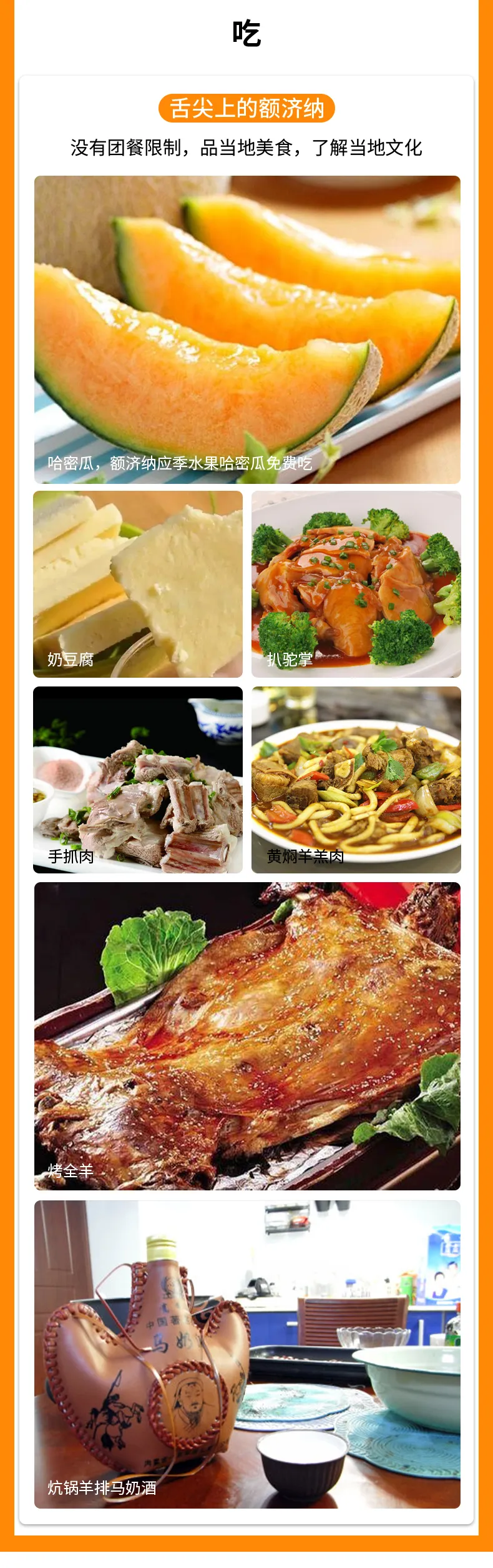 ② 受旅游地自然和经济条件限制,景点沿途餐厅的条件与中东部旅游发达地区比较,无论从硬件设施还是服务水平都有一定的差距。饮食方面,西北大部口味偏重,喜辛辣。但旅途中,品尝当地不同美食,不失为一大乐事。