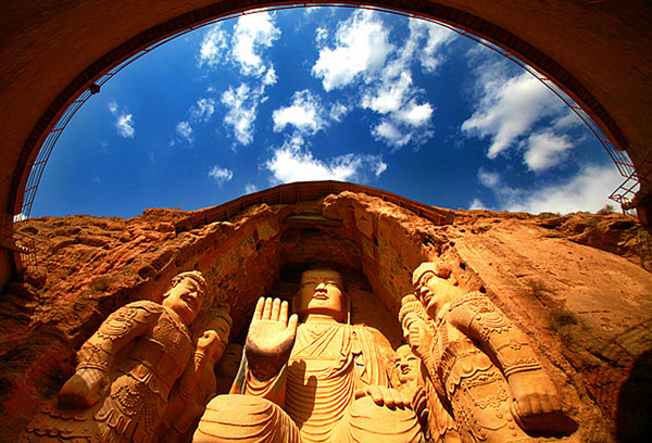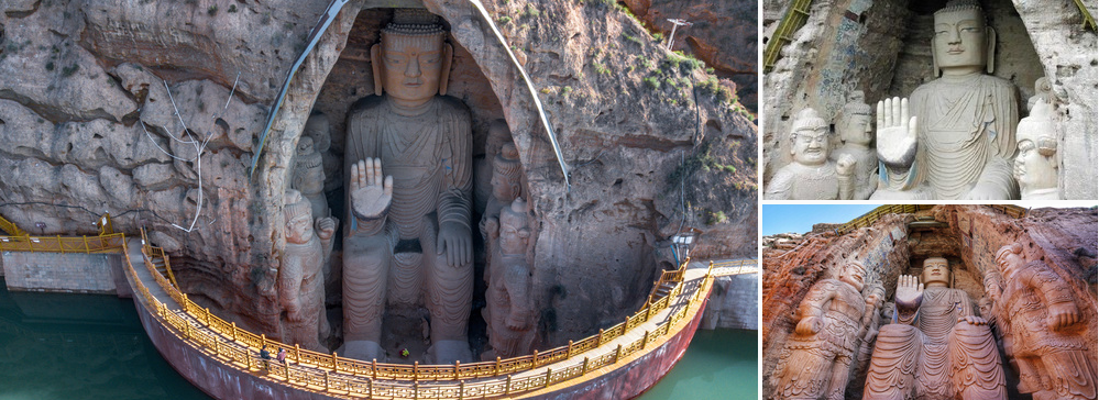天梯山石窟又称凉州石窟,俗名大佛寺,位于武威市凉州区城南约50公里处的张义镇灯山村,始建于东晋十六国时期的北凉,距今约1600余年的历史。天梯山山峰巍峨,道路崎岖,登临之难,形若悬梯,故名天梯山,山巅常年积雪,为古凉州八景之一的“天梯积雪”。其中第十三窟主尊释迦牟尼造像高约28米,宽约10米,依山面水而坐,右臂前伸,脚下碧波荡漾,薄云缠绕其身,构成了一幅山、水、佛、云浑然一体的壮观奇景,