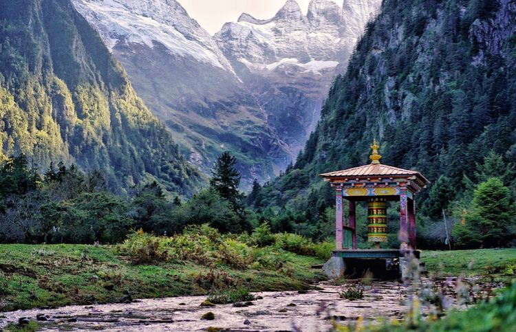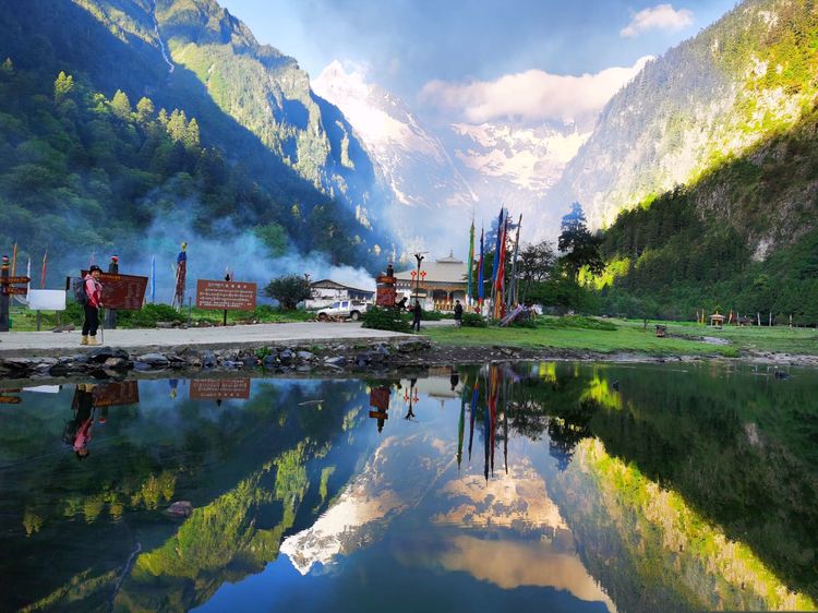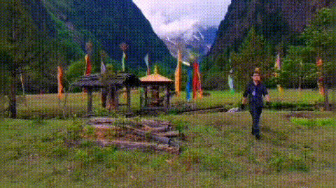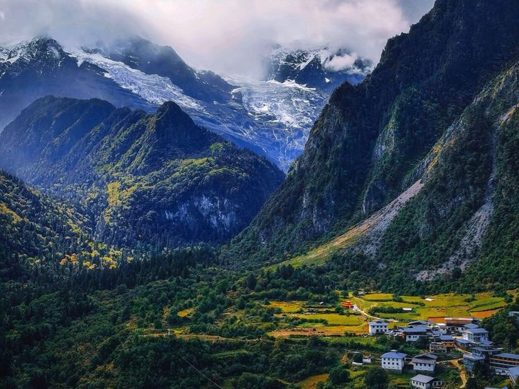 它镌刻在梅里脚下,书写着一片遗世独立的世外桃源。春天的雨崩,愈发静谧而安祥。斑斓的彩林包裹着古朴的村庄,袅袅云烟在山谷盘旋。宛如童话森林的城堡,沐浴着神山圣洁的光辉。