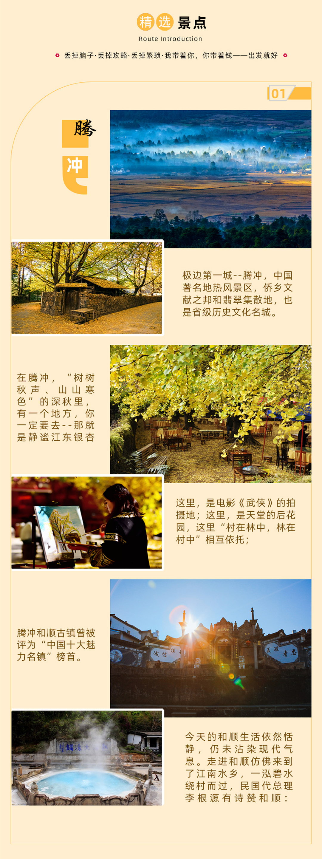早餐后前往固东镇银杏村,约1小时抵达景区,随后进入银杏村进行疯狂摄影创作。这里,是宛如天堂的静谧秋景;这里,是电影《武侠》的拍摄地;这里,是秋季里的金色梦想;这里村在林中,林在村中相互依托。这里,便是天下第一银杏王国《腾冲银杏村》。游人身临其境,仿若走进金色的童话世界。午餐特大家可以AA品尝当地特色农家乐【银杏宴】,但需提前预订哟。