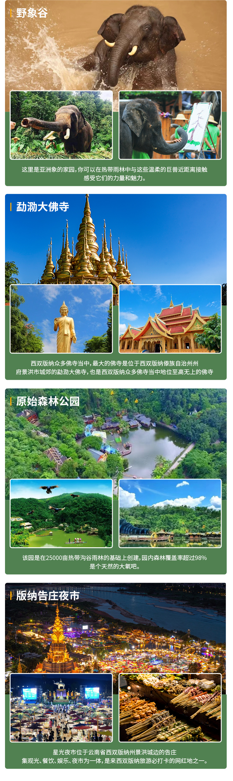 晚上咱们可闲逛久负盛名的告庄西双景,或前在湄公河星光夜市寻味各种美食,这里集结了全国各地大大小小的摊位上千个,融合了东南亚小国家的特色赶摆场,各种特色美食应有尽有。漫步在各个角落,欣赏美丽的风景,漫步感受一下西双版纳这座边境小城的傣族烟火。