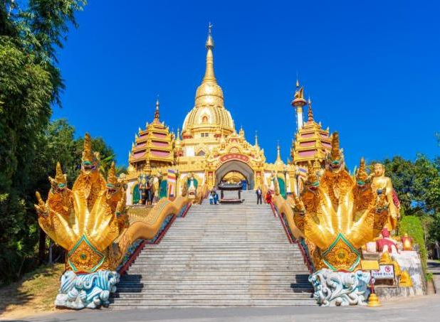 早餐后从酒店出发前往芒市【黎明之城】,车程约4小时。中午抵达芒市后自行用午餐,推荐德宏景颇当地绿叶宴,值得一尝。午餐后可以先行办理入住,随后前往游览傣式建筑风格的勐焕大金塔,金塔矗立在城市中心的山巅之上,沐日而生光,登临其间,但见云海翻涌,如置仙境