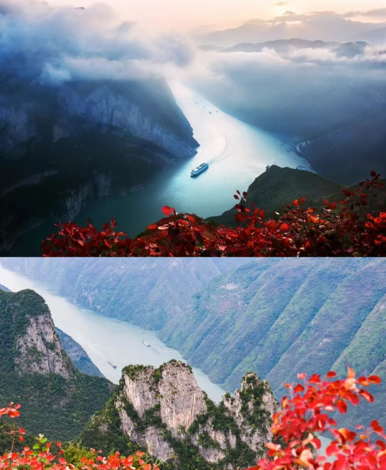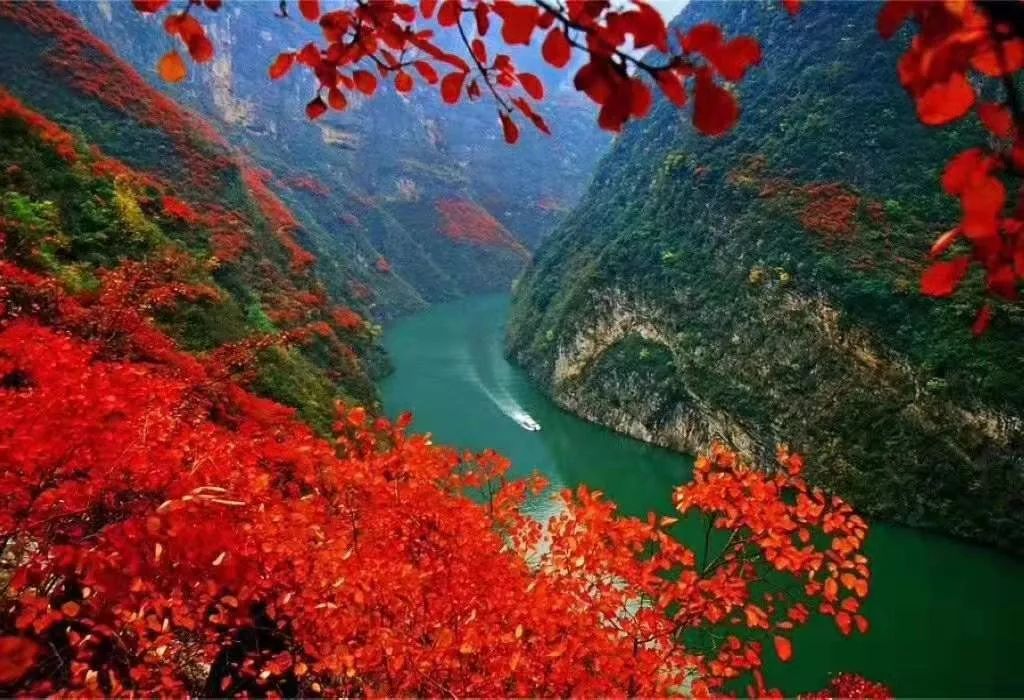 三峡声名赫赫,却少有人想起来这里看红叶,峡巅谷底均被红霞浸染,轻轻松松就能承包这漫山的红。