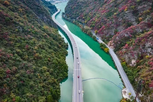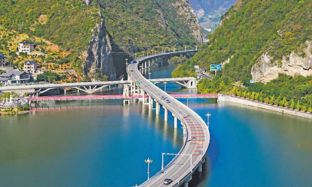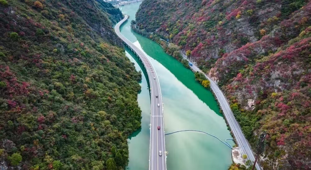 在宜昌市兴山县幽深的峡谷间,就隐藏着一条公路,它漂浮在墨绿清澈的水面上,从高处俯瞰,宛如一条长长的碧池玉带,美不胜收。初冬时节,沿途的山上红叶迎风摇曳,犹如一幅绝美的画卷。