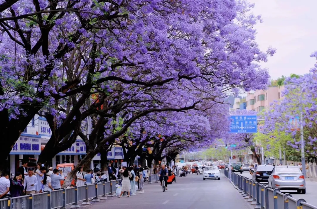 在开满蓝花楹的街道,蓝紫色的花影悄然蔓延,