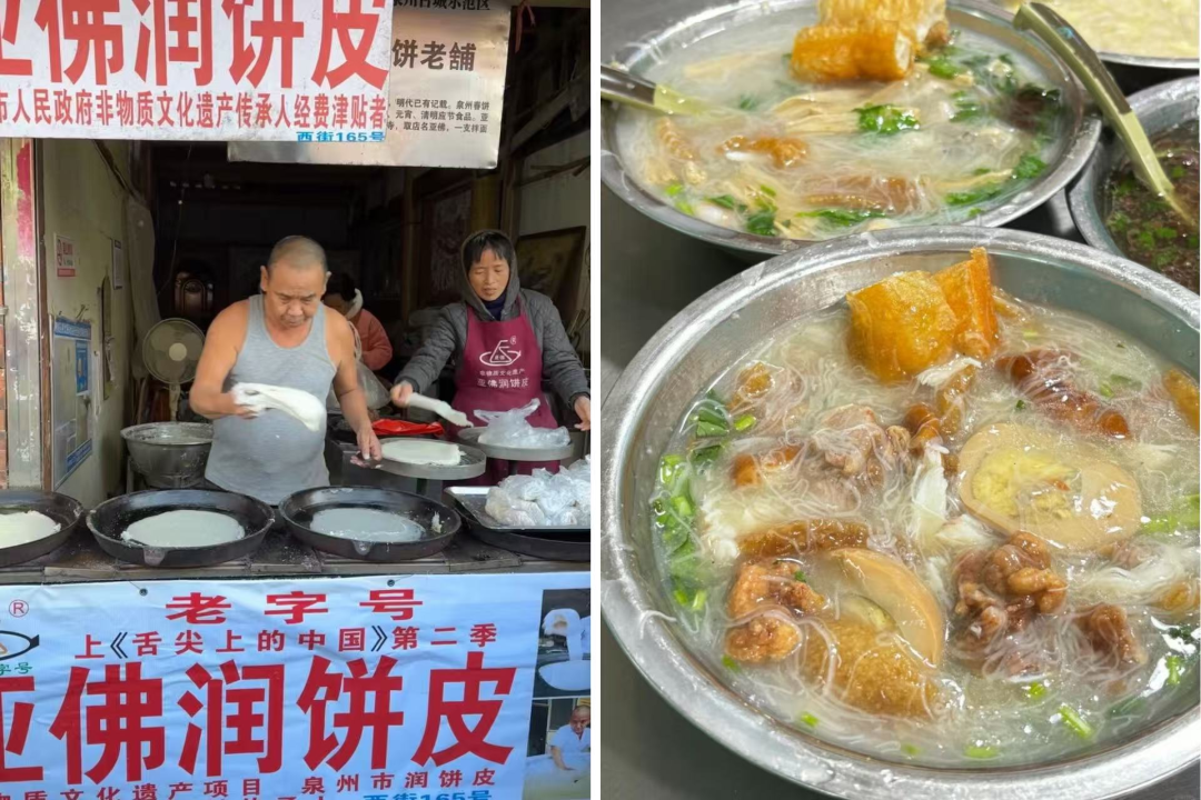 泉州美食更是值得一尝:阿文面线糊必配醋肉大肠,油条蘸汤是灵魂;再步行几十米去隔壁张林阿山姜母鸭买上一份,这个搭配绝对更是隐藏彩蛋;再尝一口亚佛润饼,薄如蝉翼间尽是闽南春意。