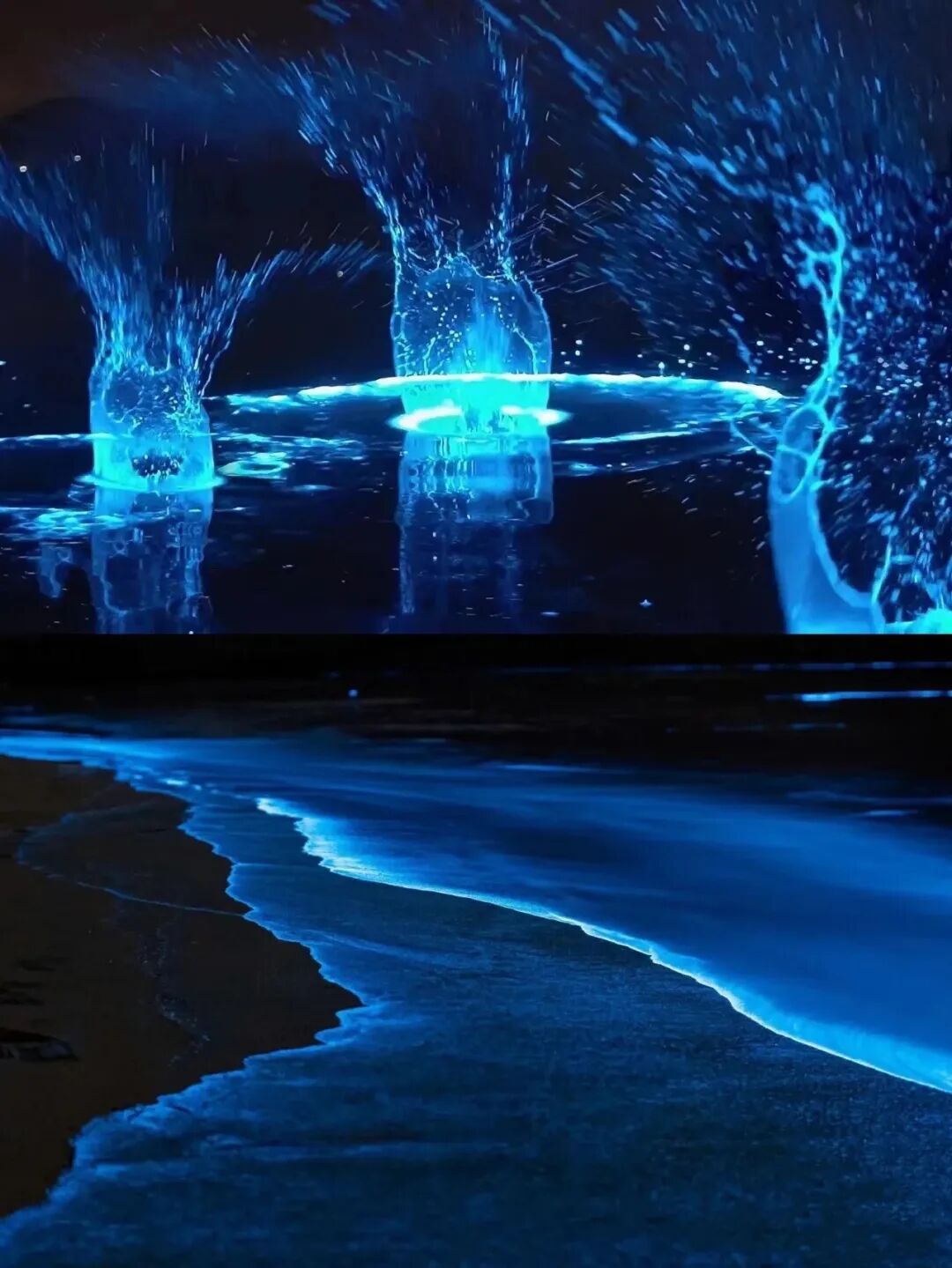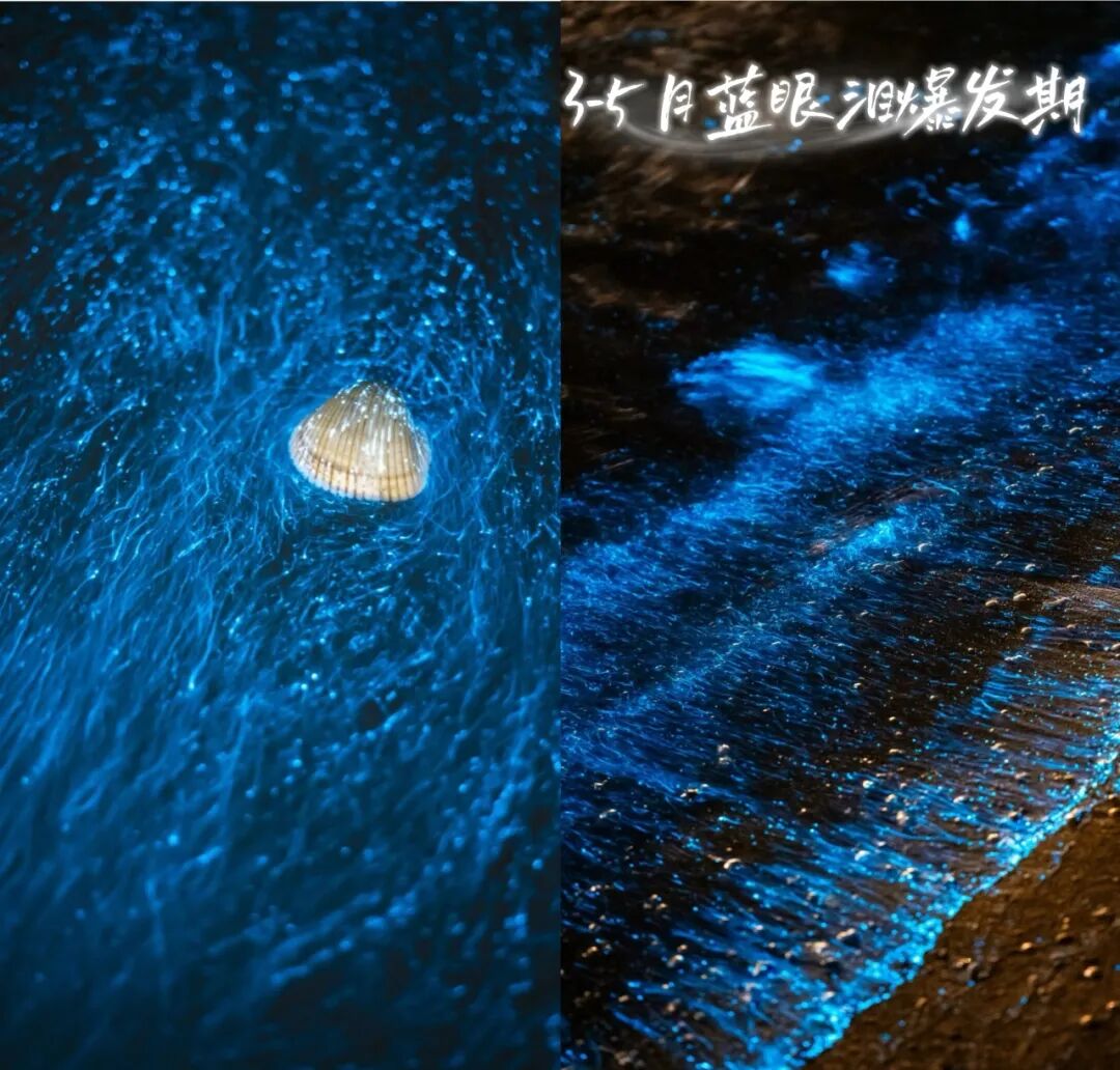 蓝色的荧光随着浪花,一阵一阵扑面而来,犹如天上的星星坠落,在暗夜海岸之上,散发幽微又明亮的美,震慑人心又勾人魂魄。