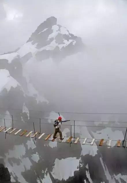 雪山之间搭起的一条木板软梯,