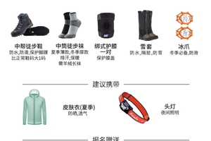 装备:登山杖1根、矿泉水1瓶、一次性雨衣1件、魔术头巾1条;