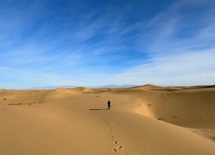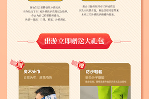 午餐之后,预计13:30左右抵达徒步起点,分发沙套、魔术头巾、登山杖等物资,之后跟随领队在沙漠徒步起点处开始做热身运动后出发,