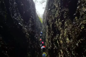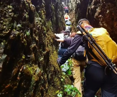 这里有金杯山 龙凤尖 肚疼寨等9座山峰 板漫沟 韭菜沟等峡谷纵横 观音洞 狮耳洞等20多个天然岩洞星罗棋布 而韭菜沟是九峰十三洞这一片最险的,因沟谷的崖壁上长满野生韭菜而得名。其崖壁陡峭如刀砍斧削,最高的有好几十米,最窄的地方侧身都是勉强通过,或许这就是吸引众多探险爱好者的原因了。