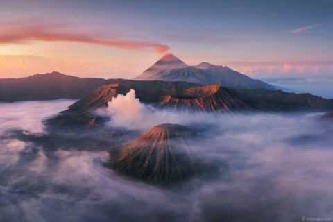 日出即将升起,云雾开始弥漫,火山喷着烟雾
