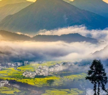 站在山顶望去,脚下大片的山谷内,油菜花层层叠叠,一望无际,中间围拢着几个小小的村落,黑瓦白墙的徽派民居夹杂在片金黄之间,在婺源再没有比这更壮观、更令人惊喜的了。