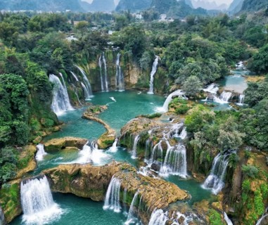 一座世界瞩目横跨中国和越南两个国家亚洲第一大跨国瀑布。与越南板约瀑布相连。瀑布气势磅礴,一波三折,层层跌落,曲折于参天古木间;更有花草掩映,百鸟低徊。 江水忽遇断崖,飞泻而下, 仰望瀑顶,群峰浮动,巨瀑如海倾;水沫飞溅,如万斛明珠。德天瀑布雄奇瑰丽,变幻多姿,碧水长流,永不涸歇
