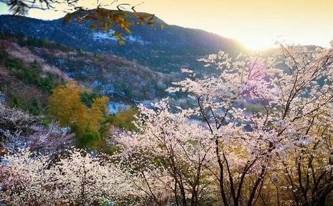 每到花季,随阳山野生樱花如同一张色彩绚丽的地毯,铺满了连绵起伏的山岭。