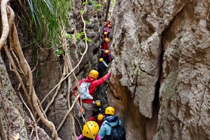 第二段地缝落差10几米,先往下下一段距离后,因地缝底端较窄,只能脚踏左右两侧的岩壁通行,惊险刺激。