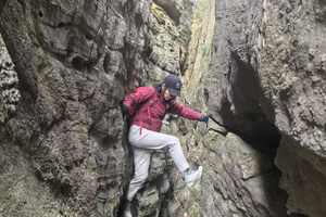 通过后,会钻一个小洞口,才能到达第三段地缝,极不易被发现。第三段地缝较之第二段,则更惊险更刺激。左右两侧的岩壁壁立千仞,行人通过时,脚下是3米多高的悬空狭缝,必需依靠臂力、肘、脚的力量缓缓通过。恐高者需谨慎报名。