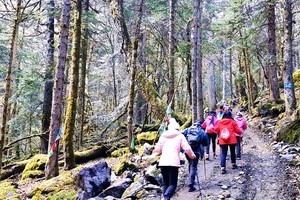 清晨用完早餐后, 从雨崩村出发,经高海拔原始森林及杜鹃丛林,徒步将近2小时后翻过海拔3900米的上那宗拉垭口,直至雨崩河底随后穿过一片原始松树林,约1小时后抵达海拔3600米的中日联合登山队“笑农大本营”。1991年由中日联合登山队修建而成,是登梅里雪山卡格博峰的一个大本营,去雨崩村旅游必去的一个地方,风景优美。