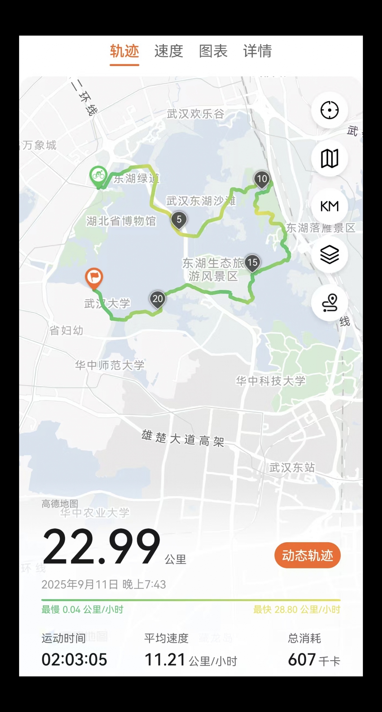19:00东湖梨园大门口集合,全程约25公里,骑行2个半小时间左右,终点武大凌波门。中途可撤退。