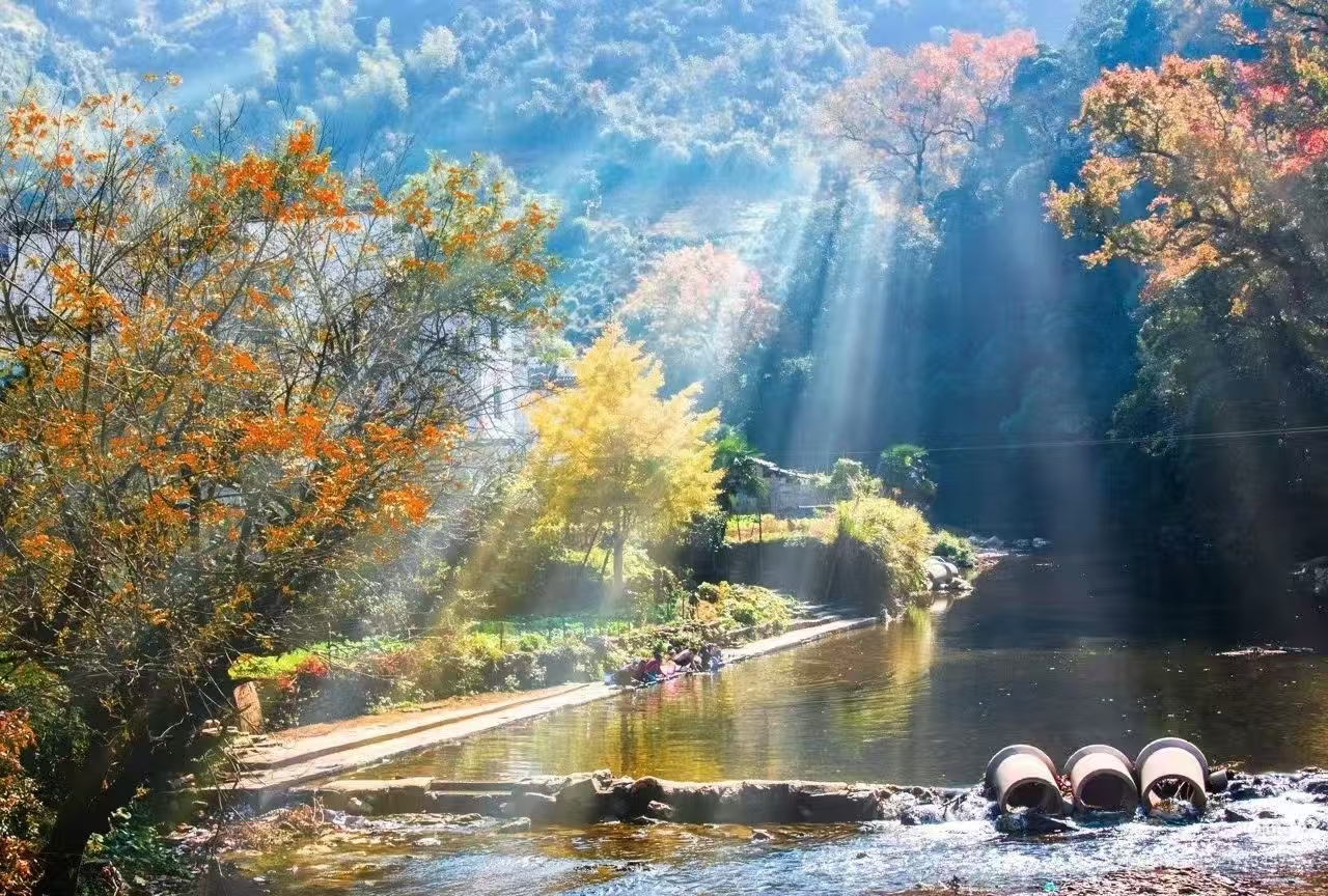 秋天的婺源,到处是温暖的颜色,有如南方冬天到来前人们早早预备的一个个防寒神器:火红、热烈、鲜艳、活泼。而石城与长溪这两个久居大山深处的村庄,则是婺源众多美丽秋景中的佼佼者。有人说石城的清晨雾气或炊烟中的火红枫树,简直就美得不像人间;也有人说整个长溪就是一副“犹抱琵琶半遮面”的绝美图画。