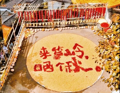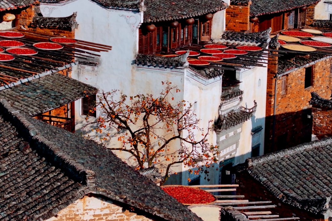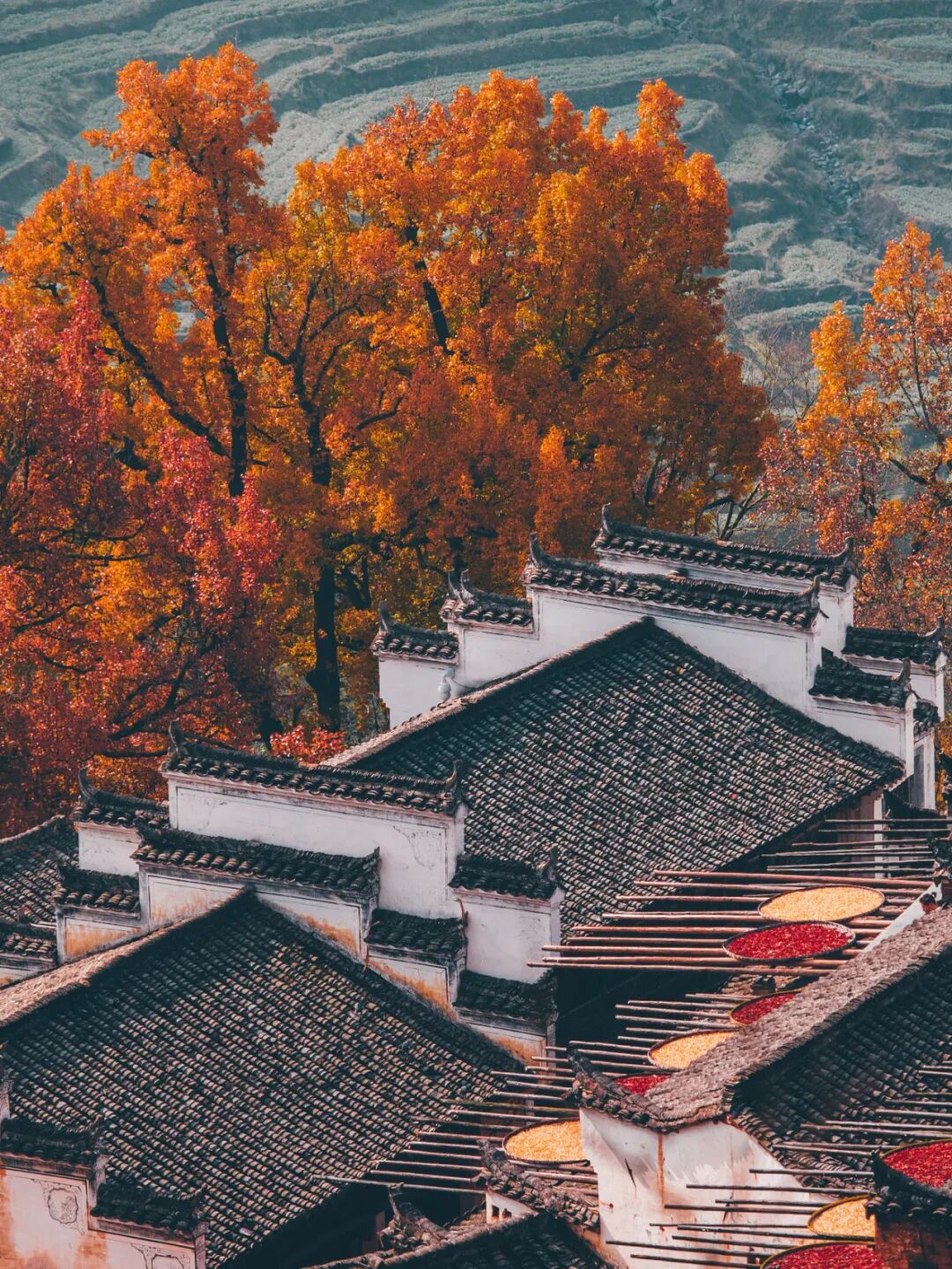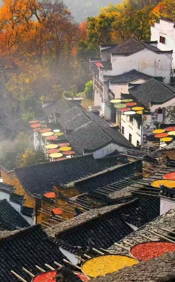 早餐后前往篁岭打卡晒秋,赏秋景区TOP10”中的第2位,成为这个秋天值得奔赴的目的地之一。数百栋徽派古宅在山崖上错落排布,火红的辣椒、金黄的玉米、橙黄的南瓜整齐的摆放在临崖的窗台,从高处向下俯瞰宛如一幅绚丽的丰收图。这独特的美景也构成了中国最诗意的秋天符号。