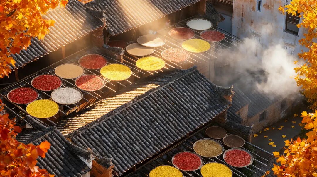 “四时俱可喜,最好新秋时”,篁岭的秋天从不会让人失望。一进古村,最先撞进眼里的就是晒秋——晒匾把崖上古村铺成了调色盘,辣椒的红,皇菊的黄,一层层搭在屋顶、挂在晒架上,风一吹,连空气里都裹着粮食的甜香。