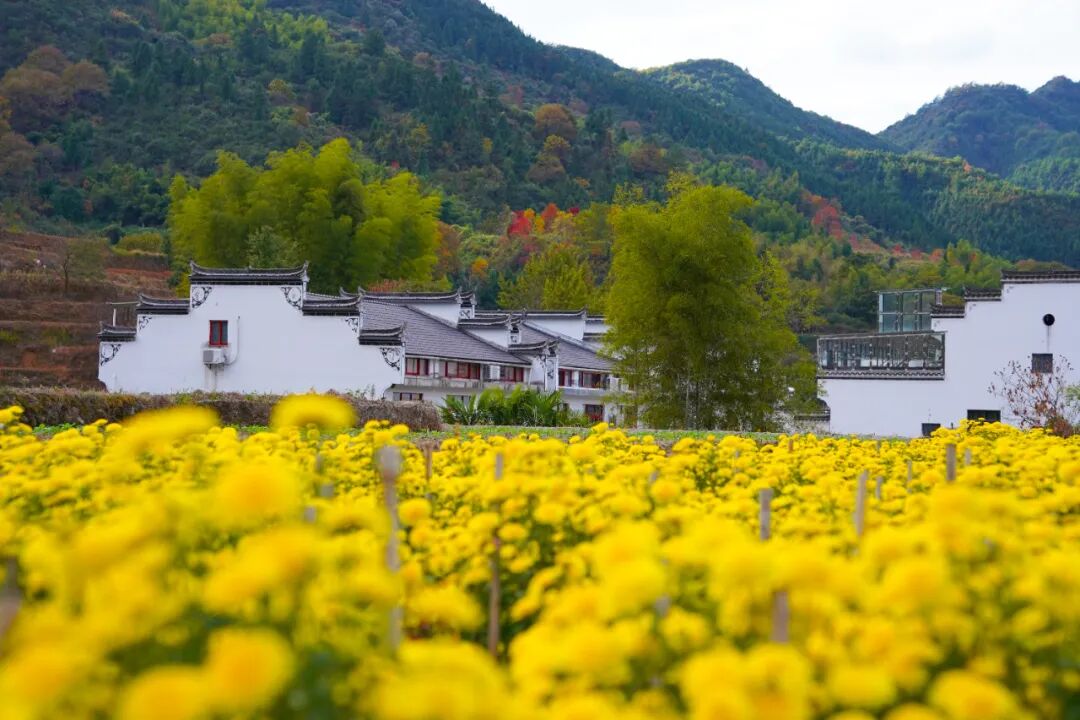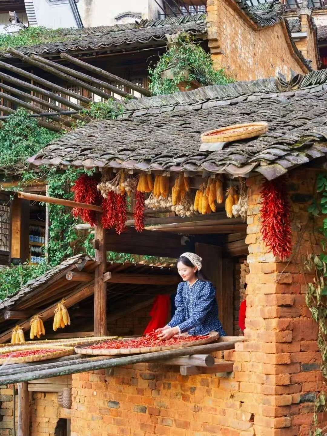 皇菊开得正盛,层层叠叠的花瓣像朝阳般艳丽,摘一朵晒干泡成茶,入口是清清爽爽的甜,提神又解腻。再过些时日,秋意更浓了。红枫红得透亮,踩在落叶上沙沙响,偶尔一阵秋风拂过,头发丝都跟着晃,像和秋天撞了个软乎乎的满怀;等到银杏登场,整个古村又添了层温柔,叶子慢悠悠从枝头飘下来,落在肩头、脚边,像在耳边轻声说“别错过这秋呀”。