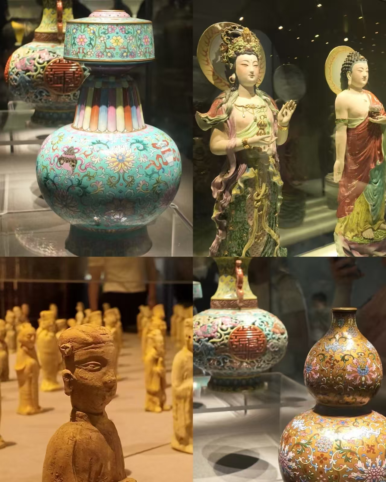 中国陶瓷博物馆既是陶瓷艺术的殿堂,也是一部立体的中国陶瓷史。这里汇聚各时期精品瓷器,种类丰富、工艺精湛。漫步其间,能领略陶瓷在造型、装饰、釉色上的演变:从秦汉陶器的简约大气,到唐三彩的色彩斑斓;从宋代名窑的温润——汝窑天青、官窑粉青、哥窑开片、钧窑窑变、定窑白瓷,到元青花的异域风情,明青花的典雅与五彩的绚丽,再到清粉彩、珐琅彩的细腻,乃至近现代陶瓷在传承中创新的活力。