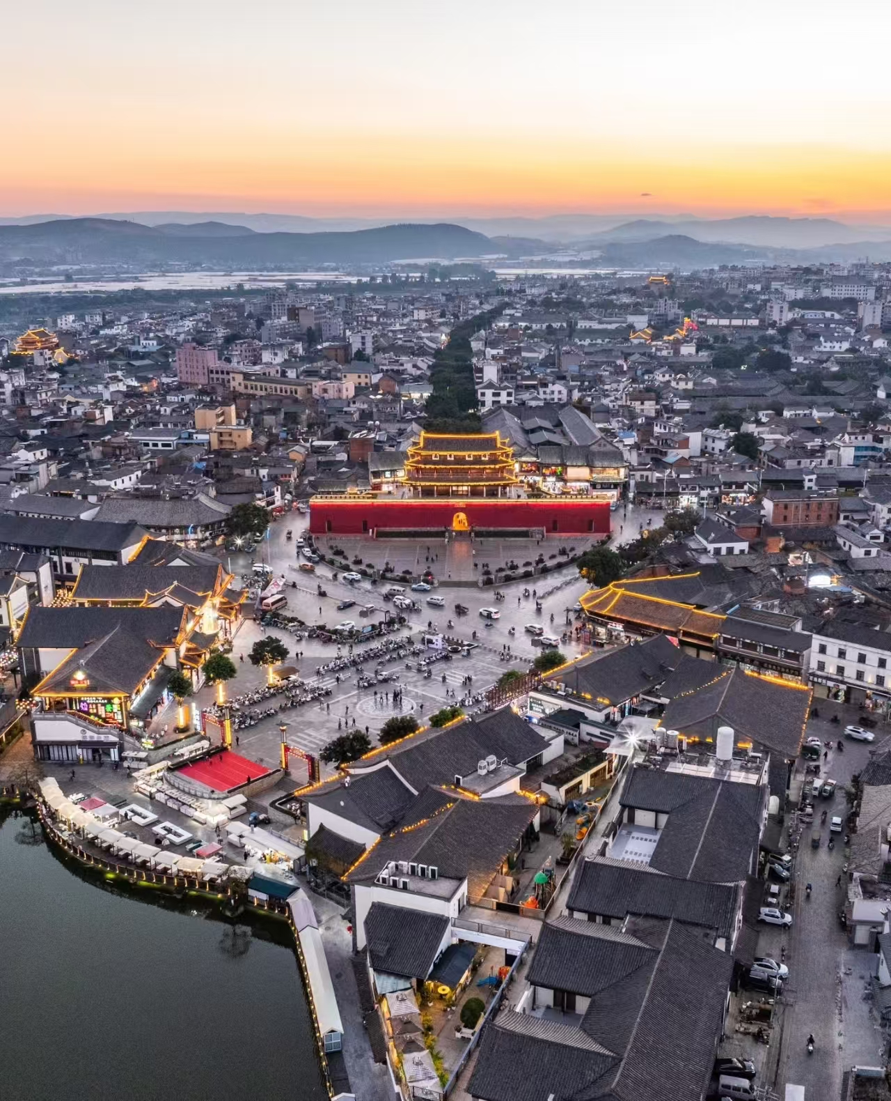 朝阳楼夜景:建水古城永贞门和北正街,朝阳楼日落,朝阳楼外小桂湖,建水乡会桥,相对于十七孔桥,人多很多。
