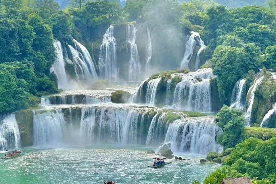 早上07点30发车,前往世界著名的亚洲第一跨国瀑布【德天瀑布】游玩,这座与越南板约瀑布相连的跨国瀑布气势磅礴,一波三折,层层跌落,曲折于参天古木间,更有花草掩映,百鸟低徊。江水忽遇断崖,飞泻直下,仰望瀑顶,群峰浮动,巨瀑如海倾,水沫飞溅,如万斛明珠。德天瀑布雄奇瑰丽,变幻多姿,碧水长流,永不干涸,中越边境清代53号界碑合影。