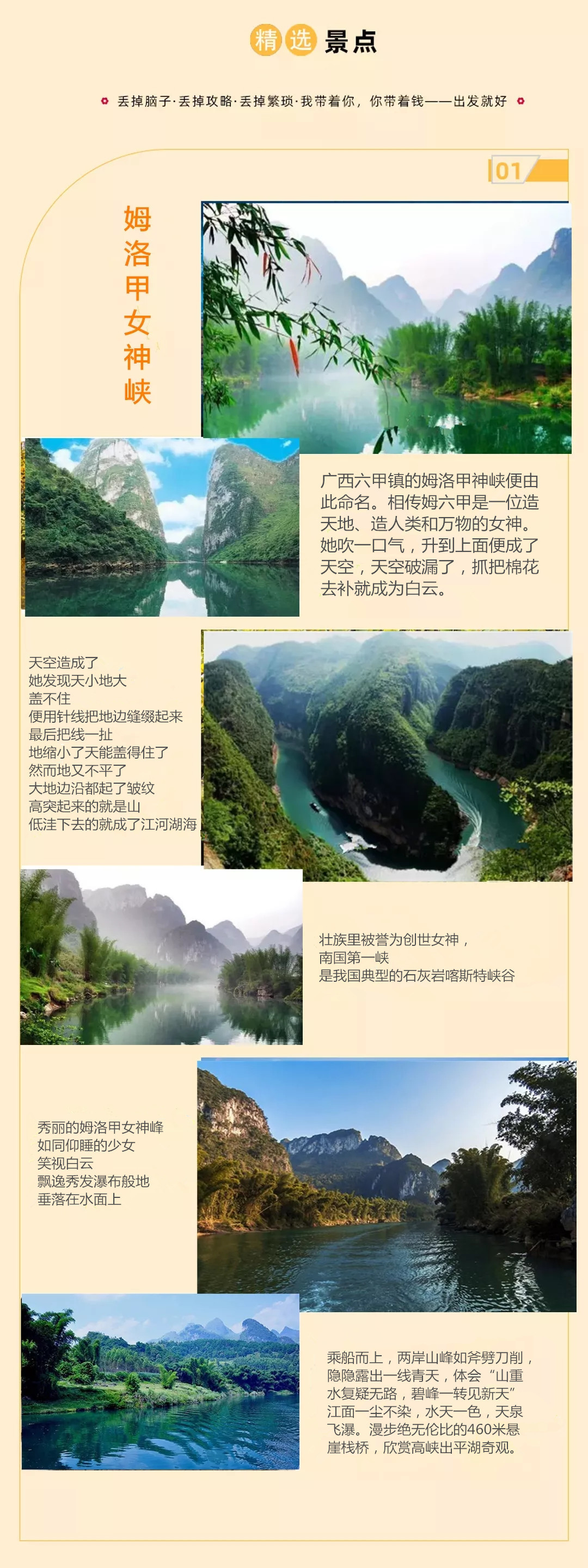 早上7点30出发,进入广西腹地,前往被誉为创世女神,南国第一峡的【姆洛甲女神峡】游玩,秀丽的姆洛甲女神峰,如同仰睡的少女,笑视白云,飘逸秀发瀑布般地垂落在水面上。