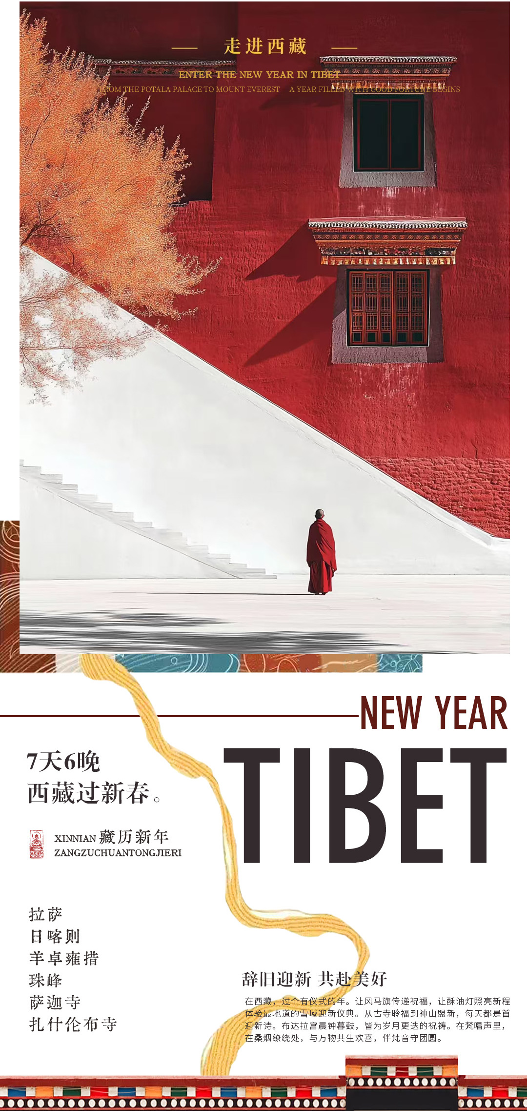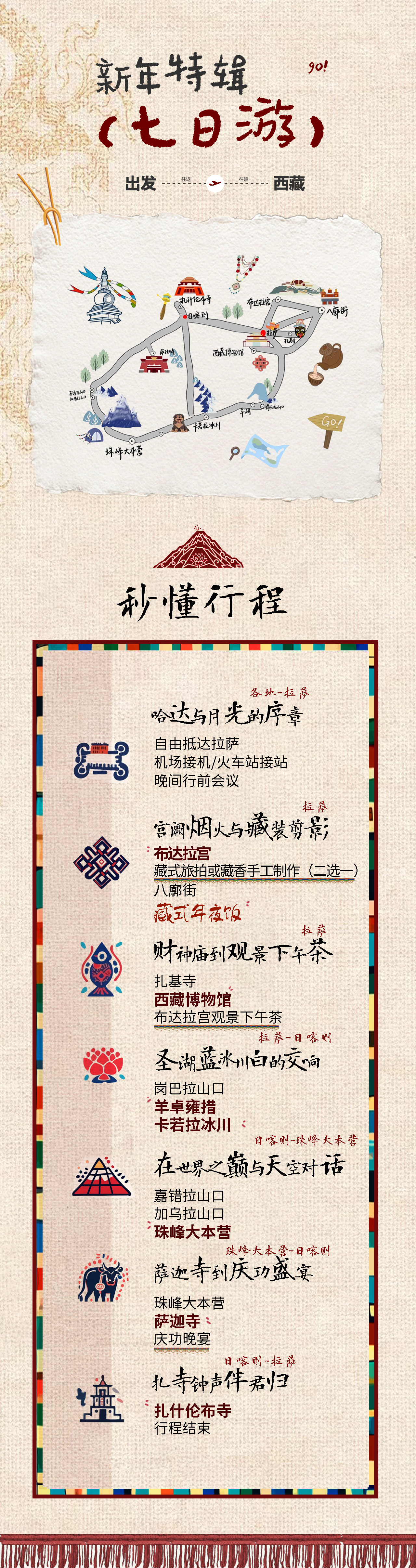1.关于天气,在藏期间早晚温差较大,建议装备厚羽绒服+带绒冲锋衣+抓绒衣+宽松的裤子+舒适的鞋子+防风围巾;请队员做好防寒防雪的准备,雨衣或者雨伞。
