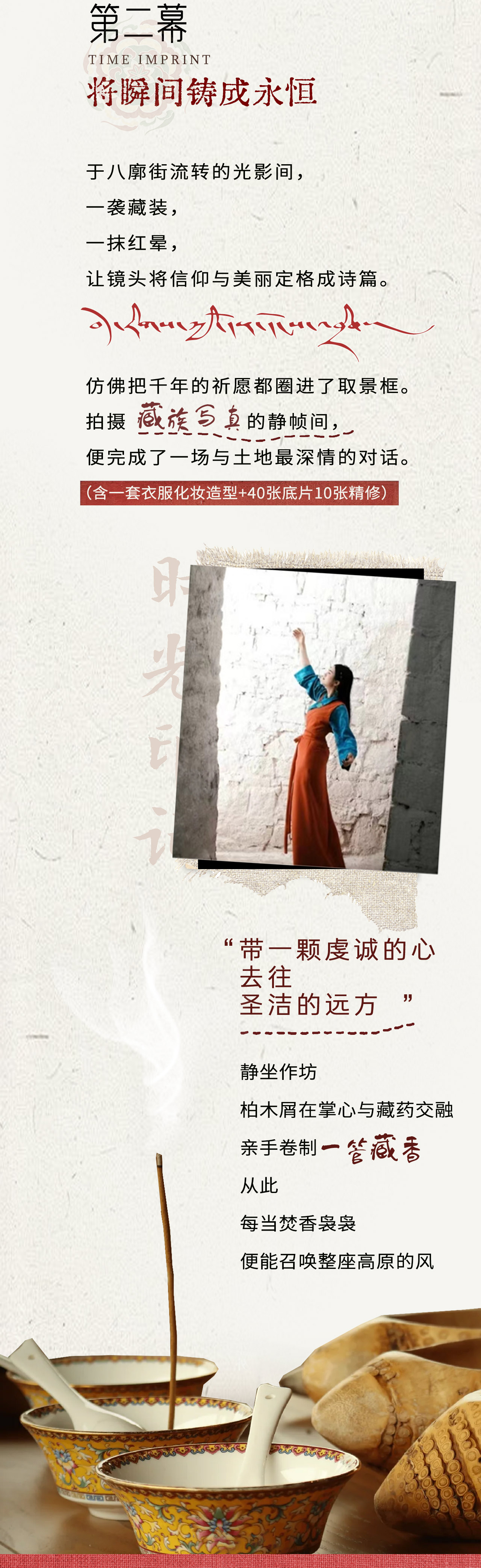 1).赠送顶级藏式旅拍——给旅行留下满满的回忆,提供专业的摄影师、化妆师,专业藏式服装,用光圈、快门记录下最美的自己;西藏非遗文化手工制作藏香(二选一)