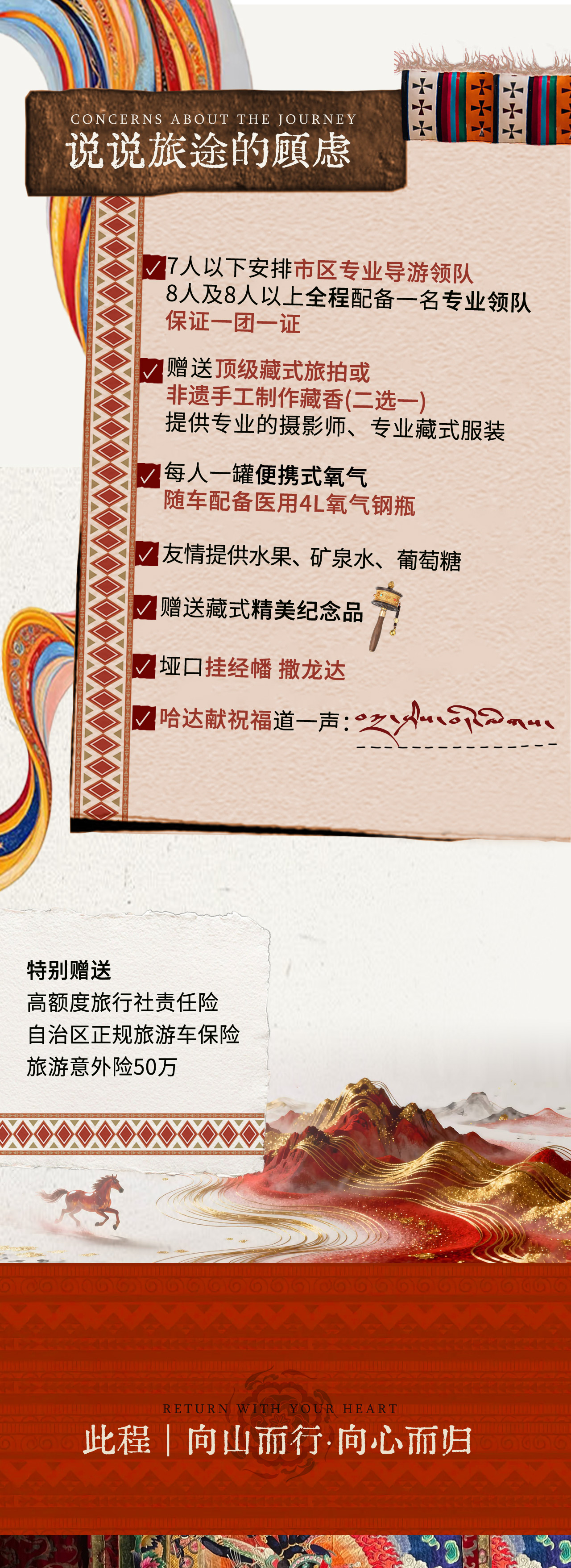 特别赠送:高额度旅行社责任险+自治区正规旅游车保险+旅游意外险50万。
