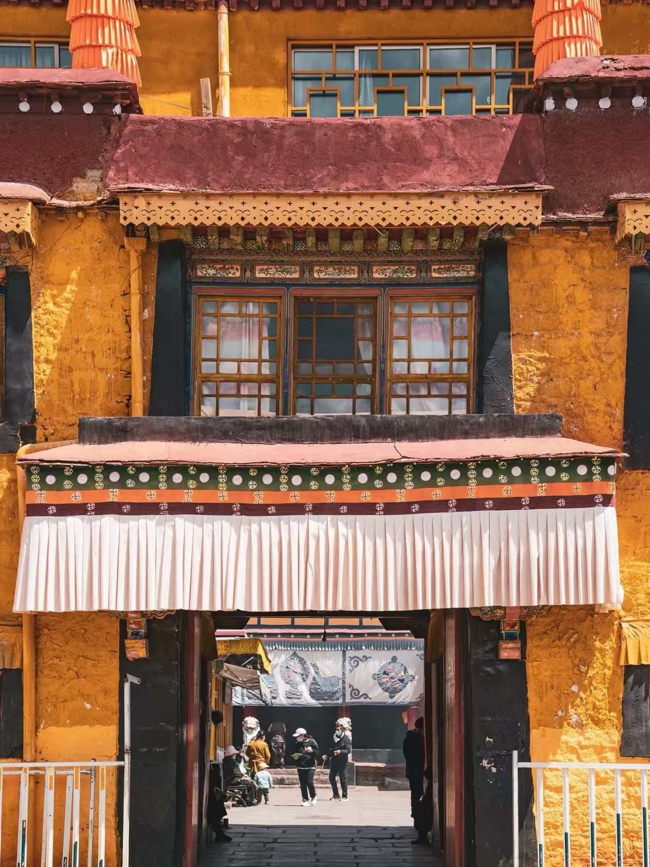 它被誉为世界十大土木建筑之一。是641年吐蕃首领松赞干布为迎娶大唐文成公主所建。布达拉宫分白宫和红宫,白宫是达赖喇嘛生活起居和政治活动的地方;红宫是历代达赖喇嘛的灵塔和各类佛殿。游走于金碧辉煌的佛殿、灵塔、寝宫、回廊之间,灯光渺渺,窗帏低垂,酥油的味道四处弥漫。整个好像落入了一个晦暗古老的梦境。