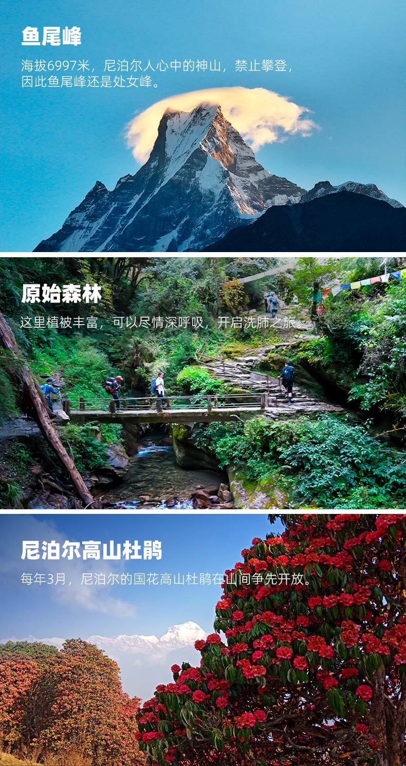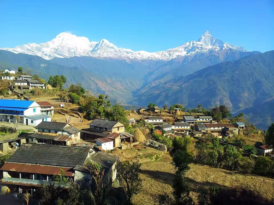 【行程概述】早晨4:00起床,徒步1小时左右前往Poon Hill观景台观看日出(这段路由于要走夜路最好携带头灯),这段路大约有3000多个台阶,所以登山杖与护膝是要随身带的,登上观景台运气好的话可观赏到日照金山。在观景台依次看到道拉吉里、安娜普尔娜Ⅰ、安娜普尔娜南、鱼尾峰等,感受喜马拉雅群山的震撼。返回客栈徒步约40分钟左右,下山途中会经过另一个观景平台,可以继续欣赏安娜普尔纳群山。早餐过后出发前往塔达巴尼Tadapani,这一段路是布恩山徒步最舒服的一段路,这里的山脊上有观景台,有林间小路、溪流、瀑布等等。徒步时间约为7小时,距离约为15公里。塔达巴尼Tadapani也是一处很好的景点,在这里可近距离欣赏鱼尾峰和安娜普尔纳南峰,是拍日落与日照金山绝佳的好地方。