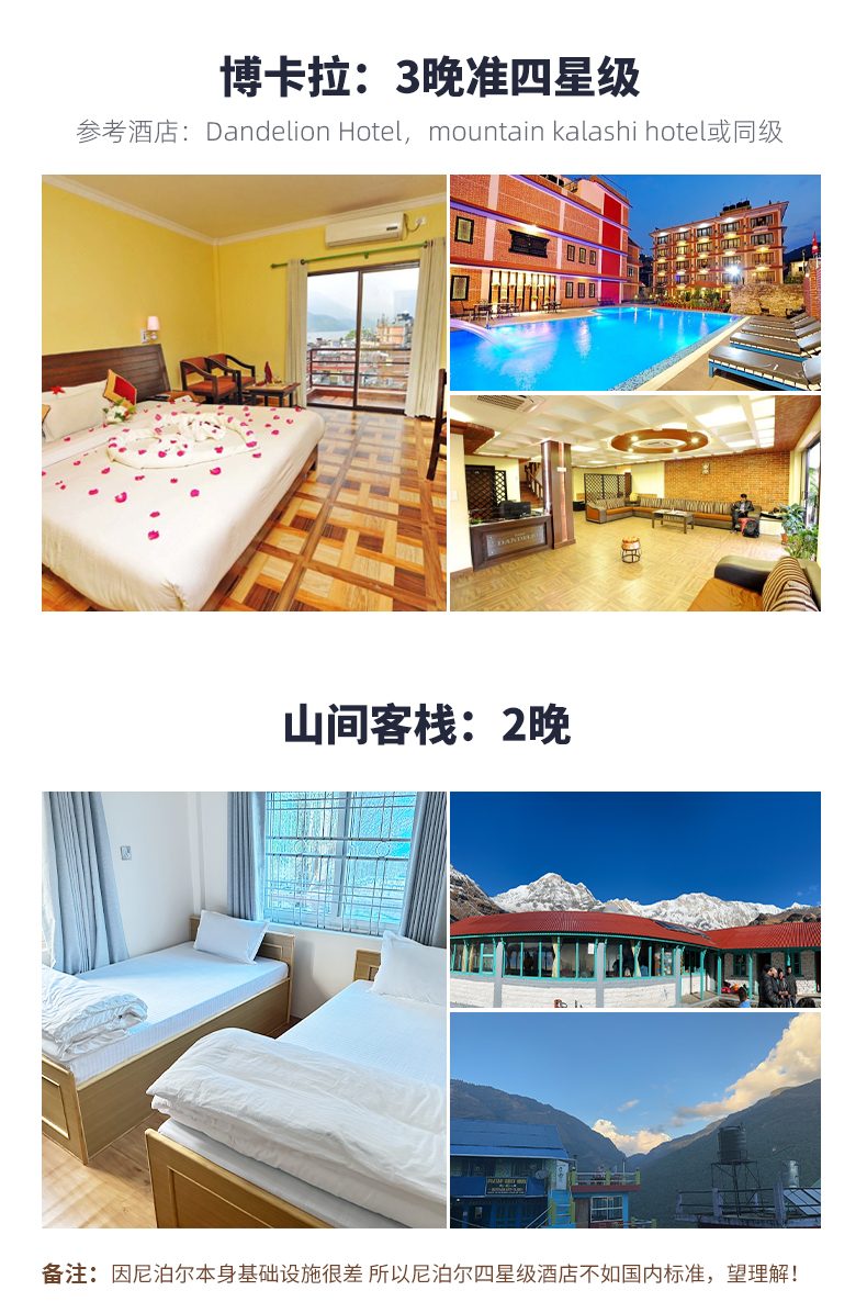 1、酒店:全程7晚住宿,加德满都2晚(准四星级)+博卡拉3晚(准四星级)+山间客栈2晚;