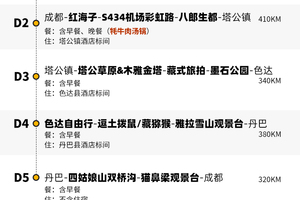 4、景交:四姑娘山双桥沟观光车70元/人(必须);墨石公园观光车20元/人(必须);红海子清洁费30元/人(可选);八郎生都清洁费30元/人(必须);色达乘车票48元/人,报名后请根据自己的游玩日期自行预约;
