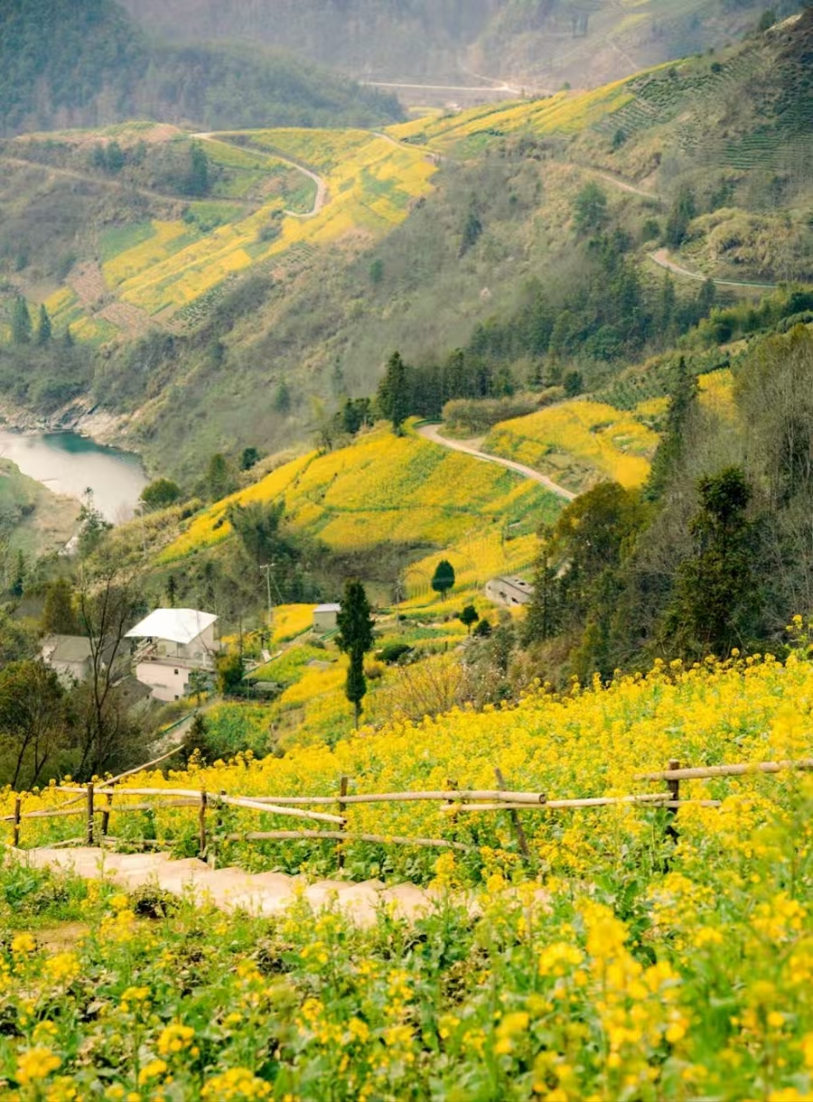 山寨云雾缭绕,漫山遍野的油菜花、梨花,盛开地如火如荼,大肆铺展在山坡上,田野里,河之洲;白色花,红色花点缀其中,到处是花的海洋,到处是色彩的世界。穿过古街古巷,然后徒步穿越石潭、北山,湖山,下汰.整个行程都在花海中,可以边玩边拍。结束后返程武汉。
