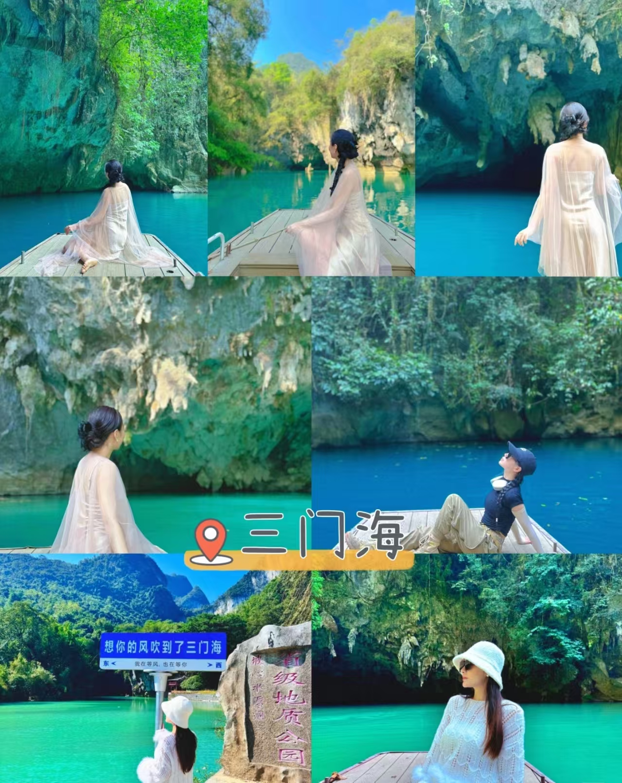 三门海由7个岩溶天窗,是串珠式天窗群,目前只有三个天窗由自然通道可乘船入内,加上蓝得像海的水使人感觉到山中有海、海上有门,“三门海”也因此而得名,这里是梦幻蓝色秘境。
